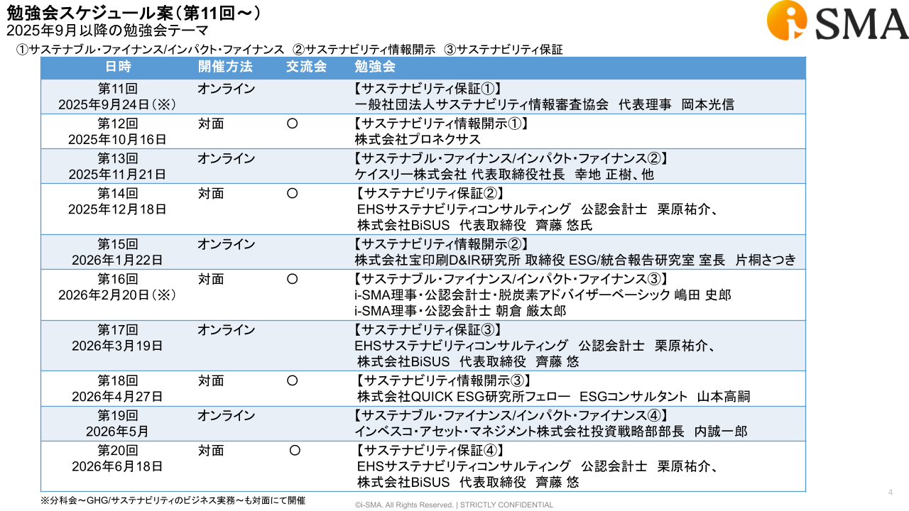 1.サステナビリティに関わる有識者に最新動向や事例を共有していただきながら、共に学び、議論する場を提供すること。